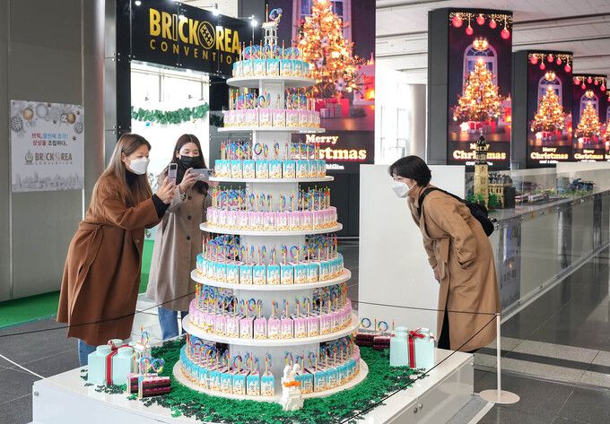 19일 서울 코엑스 1층 로비에서 개막한 ‘브릭코리아 컨벤션 10주년 기념전’ 현장에서 방문객들이 10주년 기념 작품인 대형 레고 케이크를 관람하고 있다. |