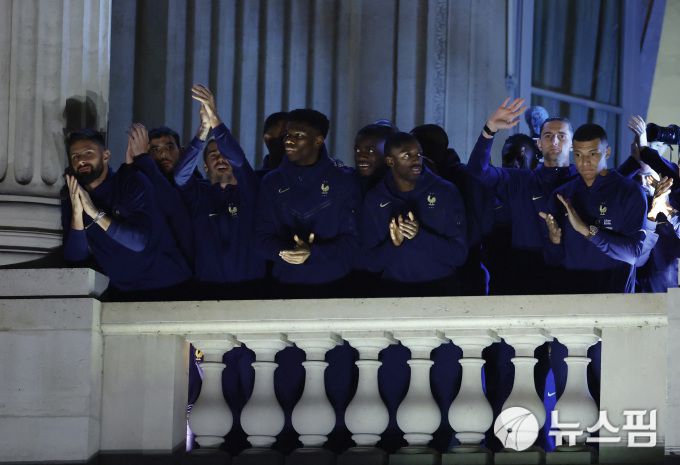 [파리 로이터=뉴스핌] 이나영 인턴기자= 프랑스 축구 국가대표팀이 19일(현지시간) 파리 크리용 호텔 발코니에서 팬들에게 인사를 하고 있다. 프랑스는 아르헨티나와 접전 끝에 월드컵 준우승을 차지했다. 2022.12.19 nylee54@newspim.com |