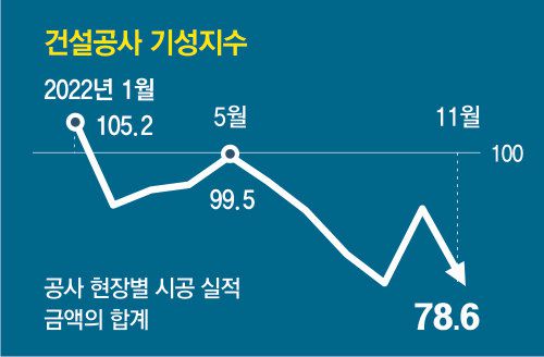 건설사들이 평가한 경기 체감 지표가 12년 만에 최악으로 내려앉는 등 건설 경기가 악화일로를 걷고 있다. 내년 상반기(1∼6월)에는 건설 경기가 더 나빠질 거라는 전망이 나오며 건설업계 위기감이 증폭되고 있다. 건설업 종사자 약 165만 명은 물론이고 연관 산업 종사자 수백만 명이 관련된 건설 경기가 이대로 무너지면 한국 경제에 직격탄이 될 수 있다는 우려가 나온다.