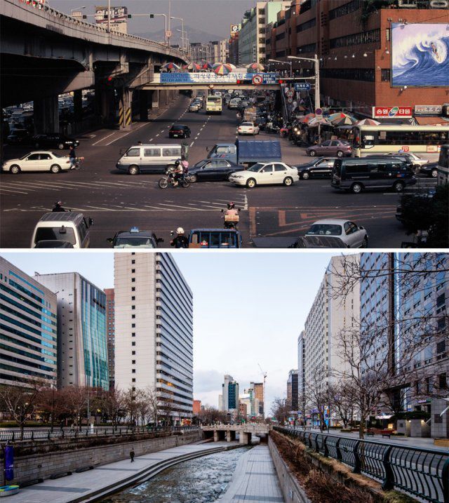 1996년 서울 중구 충무로와 동대문구 용두동 사이에 위치했던 ‘청계고가도로’(위쪽 사진). 서울연구원은 2003∼2005년 진행된 청계천 복원 사업의 각 단계마다 참여하며 복원을 이끌었다. 아래쪽 사진은 시민 쉼터로 자리매김한 청계천의 2020년 모습. 서울연구원 제공 |