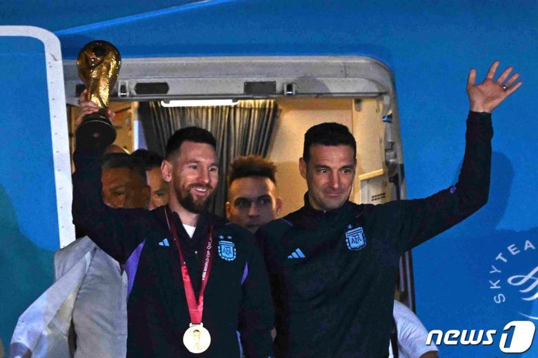 (에쎄이사 AFP=뉴스1) 김성식 기자 = 20일(현지시간) 아르헨티나 부에노스아이레스 인근 에쎄이사 국제공항에서 2022 카타르 월드컵 트로피를 쥔 리오넬 메시(왼쪽)가 리오넬 스칼로니 아르헨티나 축구 대표팀 감독(오른쪽)과 함께 여객기 출구 계단으로 나와 손을 흔들고 있다. 2022.12.20. ⓒ AFP=뉴스1