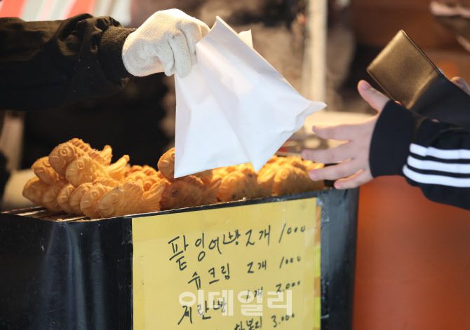 [이데일리 노진환 기자] 겨울철 대표 간식인 붕어빵 가격이 5년 전보다 두배 이상 오른 것으로 나타났다. 지난 14일 한국물가정보원에 따르면 올겨울 붕어빵 2마리 가격은 기본 1천원 수준이다. 지역에 따라서는 1마리에 1천원인 곳도 있었다. 붕어빵 가격이 오른것은 팥, 밀가루 등 원재료 가격의 상승 영향이 가장 크다. 속 재료로 많이 사용되는 붉은 팥(수입산)은 800g 평균 가격이 6천원으로 5년 전(3천 원)보다 100%, 지난해(5천원)보다는 20% 올랐다. 밀가루(중력)는 1kg 가격이 1천880원으로 5년 전보다는 46.9%, 작년보다는 18.2% 올랐다. 21일 서울 서대문구 신촌역 인근에서 한 시민이 붕어빵을 구매하고 있다.