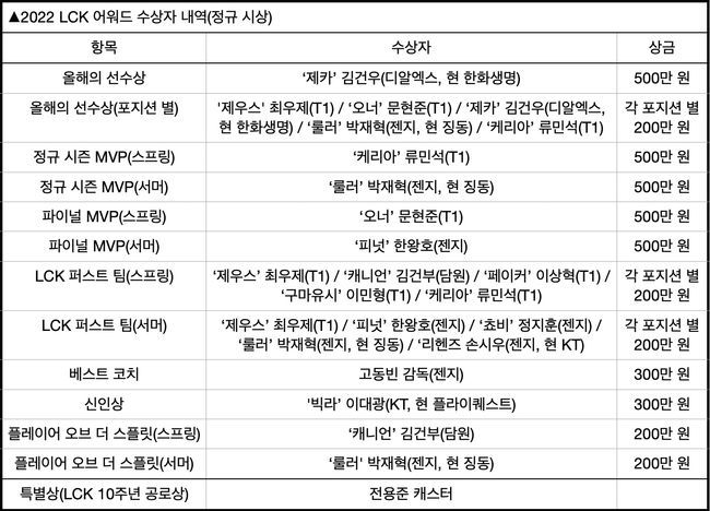 한편 정규 시상 기준 2022년 가장 많은 타이틀을 수상한 선수는 ‘룰러’ 박재혁이다. 박재혁은 서머 시즌 ‘플레이어 오브 더 스플릿’ ‘정규 시즌 MVP’ ‘퍼스트 원거리 딜러’ ‘올해의 원거리 딜러’ 등 4관왕을 달성했다. ‘제우스’ 최우제, ‘케리아’ 류민석은 2관왕, ‘피넛’ 한왕호, ‘캐니언’ 김건부, ‘오너’ 문현준은 2관왕에 올랐다. 지난해 ‘쇼메이커’ 허수가 6개의 본상을 휩쓴 것과 다르게 많은 선수들이 고르게 상을 수상했다.