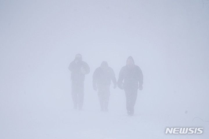 [뉴욕=AP/뉴시스]24일(현지시간) 미국 뉴욕 버팔로에서 3명의 시민이 눈보라 속을 걷고 있다. 폭설과 강풍으로 가시거리가 제로에 가까운 '화이트아웃' 현상이 벌어지고 있다. 버팔로에는 이날 70㎝ 이상의 눈이 쌓였다. |