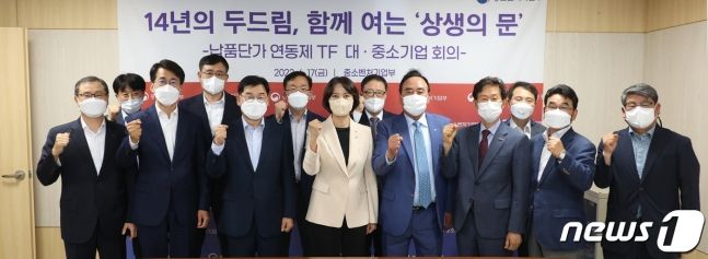 이영 중소벤처기업부 장관(왼쪽 네 번째)이 ‘납품단가 연동제 TF 대·중소기업 회의’ 참석자들과 기념사진을 찍고 있다(뉴스1DB)/뉴스1 |