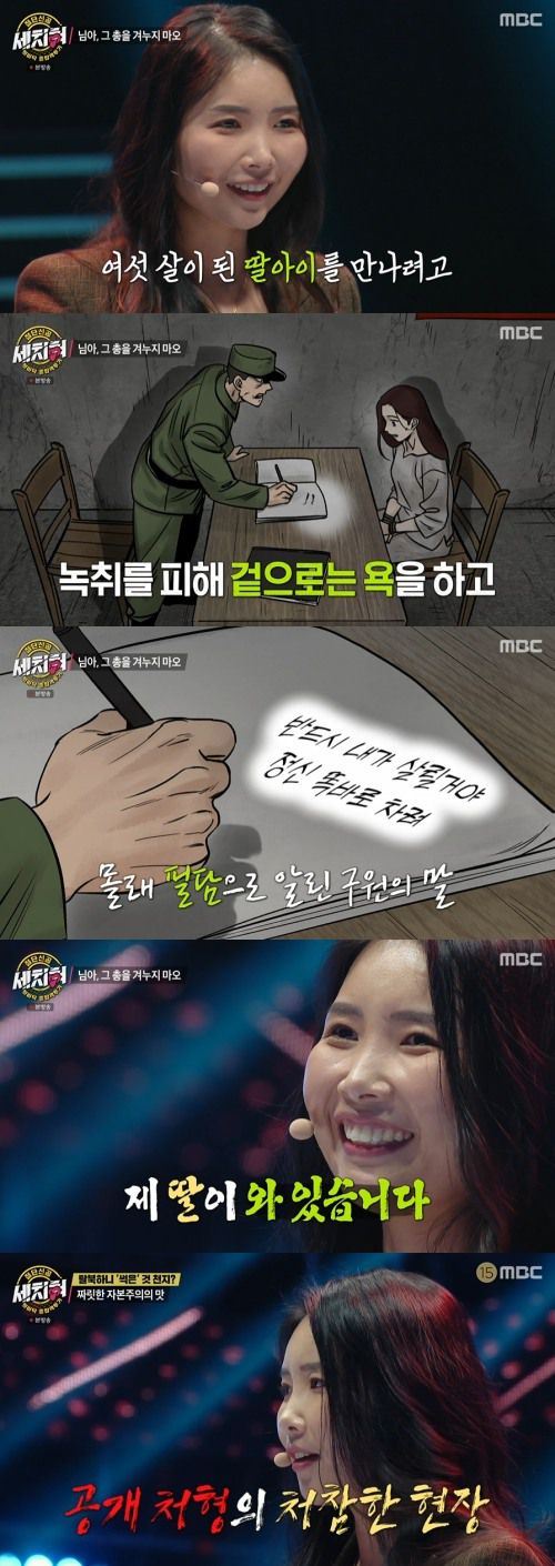 그런 윤설미에게 기적 같은 일이 일어났다. 윤설미는 “같은 대학을 다녔던 동무가 보위 지도원이 돼서 제 담당 취조원으로 앉아 있었다. 정말 신이 기도를 들어줬나 보다. 겉으로는 욕을 하고 글로 써서 살린다고. 정신 똑바로 차리라고. 그분이 저를 살려서 저는 다시 탈북에 성공했다”라며 촬영 현장에 딸이 와있다고 밝혀 놀라움을 안겼다.