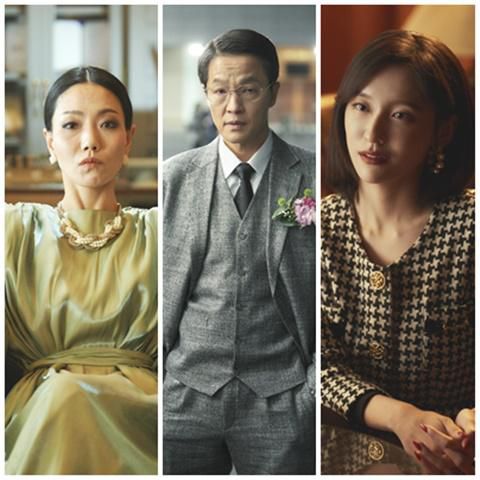 드라마 '재벌집 막내아들' 속 순양가 사람들. 진양철 회장의 외딸이자 막내인 진화영(왼쪽 사진부터·김신록)과 둘째 진동기(조한철) 그리고 손주며느리 모현민(박지현)은 순양가를 차지하기 위해 폭주한다. JTBC 제공