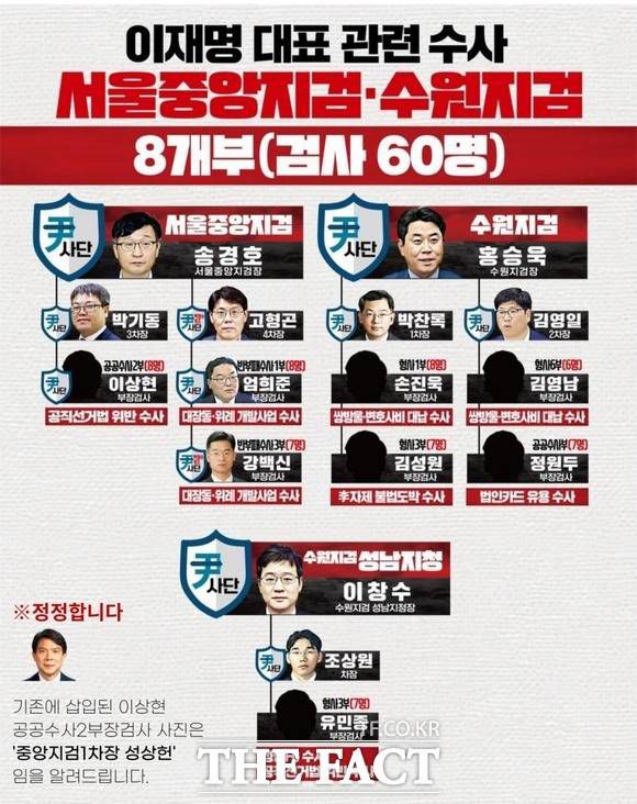 앞서 민주당은 지난 23일 '이재명 대표 관련 수사 서울중앙지검·수원지검 8개 부(검사 60명)'이라는 제목으로 웹자보를 만들어 당원들에게 배포했다. 웹자보에는 대장동 사건을 수사 중인 송경호 서울중앙지검장, 쌍방울 변호사비 대답 사건 등을 수사 중인 홍승욱 수원지검장, 성남FC 후원금 사건을 수사 중인 이창수 성남지청장을 비롯해 이들 휘하 일선 수사 검사 등 총 16명의 실명을 공개했다. 이중 10명은 사진도 함께 공개했으며 11명의 사진 앞에 '尹사단'이라고 써 있다.