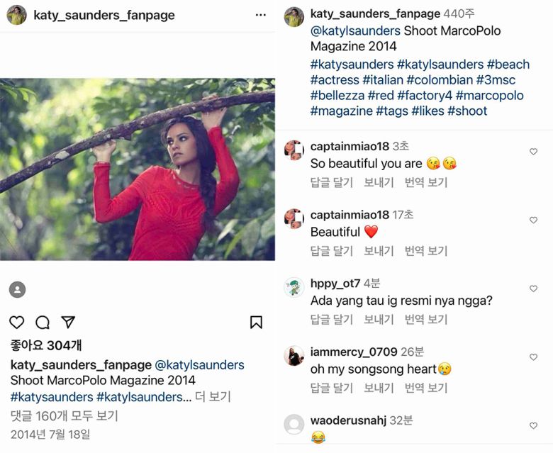 2014년을 끝으로 피드가 중단된 케이티 루이스 사운더스의 인스타그램 팬페이지에는 현재 송중기 팬들의 댓글이 이어지고 있다. 무려 8년 전 피드글에 “송중기의 여자친구가 맞냐”는 질문이 계속 올라오고 있다. 팬들은 케이티의 과거 인스타 사진을 찾아 혹시 모를 송중기의 흔적을 찾고 있다.