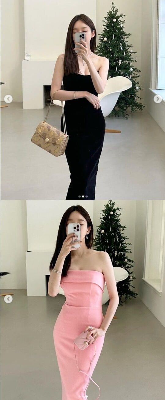 공개된 사진에는 블랙과 핑크 드레스를 입은 강민경의 모습이 담겼다. 콜라병 몸매가 눈길을 끈다.
