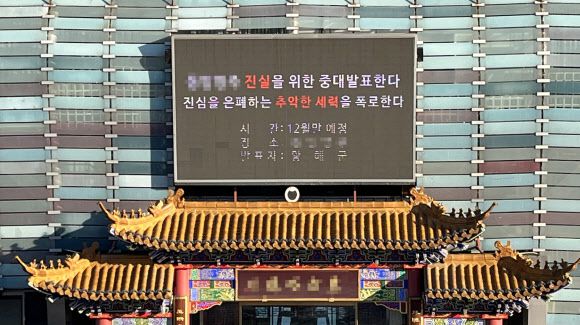 서울 송파구 잠실동 한강공원의 유선장에서 영업 중인 한 중식당은 28일 식당 외부 전광판에 “진실을 위한 중대 발표를 한다. 진실을 은폐하는 추악한 세력을 폭로한다”는 메시지를 띄웠다.