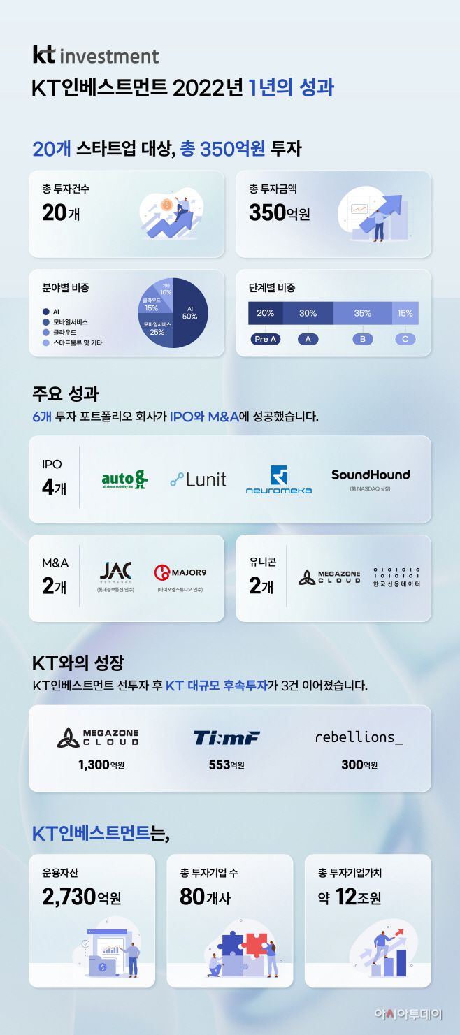 KT인베스트먼트는 올해 투자시장이 급격히 위축되는 가운데서도 6개의 피투자사가 IPO 및 M&A를 진행하는 우수한 투자성과를 달성했다. 우리나라 스타트업의 IPO나 M&A 성공률이 미미하다는 점을 고려하면, KT인베스트먼트의 올해 성과에 대해 시장의 반응은 뜨겁다. 의료 인공지능 기업 루닛, 협동로봇 대표 기업 뉴로메카, 자동차 애프터마켓 플랫폼 오토앤은 코스닥에 상장했고, 미국의 대화형 AI 기업인 사운드하운드는 나스닥에 상장했다. 전기차 충전기 제조사인 중앙제어, 엔터테인먼트 기업인 메이저나인은 각각 롯데정보통신과 바이포엠스튜디오에 인수합병(M&A)되었다. 또한, 피투자회사 중 메가존클라우드와 한국신용데이터는 유니콘으로 도약했다.