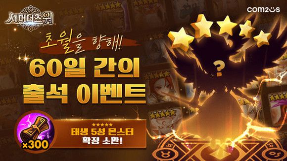 역할수행게임(RPG) '서머너즈워:천공의아레나'에서는 다음달 1일 정오와 오후 10시, 2회에 걸쳐 1시간 동안 전투 때 에너지가 소모되지 않는 행사가 진행된다. 또, 내년 2월28일까지 '60일 간의 출석이벤트'를 실시한다. 행사 기간 동안 이용자는 매일 1회 게임에 접속만 해도 '초월의 소환서 조각' 5개를 받을 수 있다. 60일 동안 매일 출석해 누적 조각 수 300개를 달성하면 태생 5성 불, 물, 바람 속성의 몬스터를 획득할 수 있다. 보너스 선물도 제공된다. 아울러 누적 출석 횟수 10일마다 '찬란한 소환의 축복', '신비의 소환서', '연성석' 등도 지급된다.