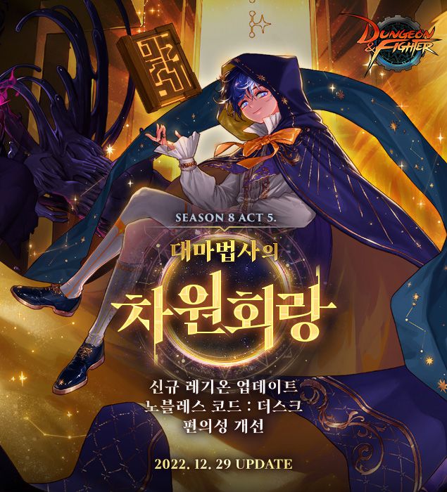 ‘대마법사의 차원회랑’은 지난 7월 업데이트된 ‘빼앗긴 땅, 이스핀즈’에 이은 두 번째 레기온 던전으로, 상급 던전 이상의 난도를 갖는다. 이와 함께 새해를 맞아 1월 1일부터 12일까지 접속 이벤트를 실시한다. 게임에 20분 23초 동안 접속할 시 1월 1일에는 모험단·캐릭터·크리쳐 이름 변경권, 2023 토끼 데미지 폰트를 제공하며, 이 외 일일 보상으로 코인(2개), 하트 비트 메가폰, 칼레이도 박스(1개)를 지급한다. 또, 누적 접속 일자에 따라 왜곡된 차원의 큐브(3개), 기운 변경 종합 세트 상자 등을 추가 제공할 계획이다.