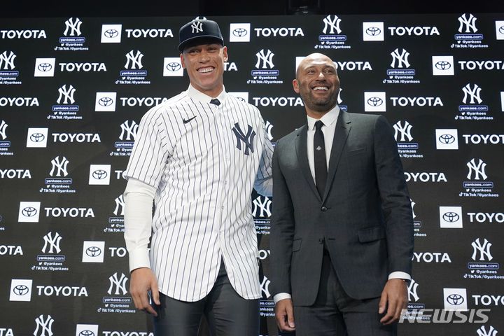 [뉴욕=AP/뉴시스] 뉴욕 양키스의 애런 저지(왼쪽)가 21일(현지시간) 뉴욕 양키 스타디움에서 열린 기자회견 중 양키스의 전 주장인 데릭 지터와 함께 기념사진을 찍고 있다. 저지는 9년간 3억6천만 달러(약 4636억 원)에 계약했으며 양키스의 16대 주장으로도 임명됐다. 2022.12.22. |