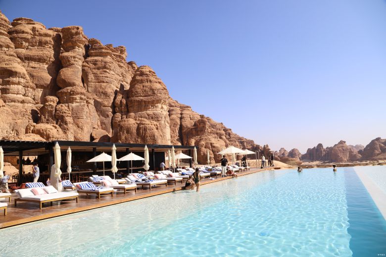 사막에 수영장을 만들어놓은 사우디 북서부 알울라의 해비타스 리조트. 인피니티풀 너머로 장엄한 바위 협곡이 보인다. |