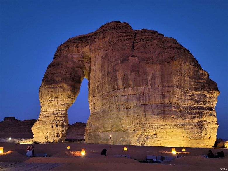 알울라 코끼리 바위는 해질녘 노을빛에 황금색으로 물들어 간다. 코끼리 바위 앞에 있는 모래 사막에는 구덩이를 파고 차를 마실 수 있는 야외 공간이 있는데, 해가 지고 횃불이 들어오면 환상적인 분위기가 된다.