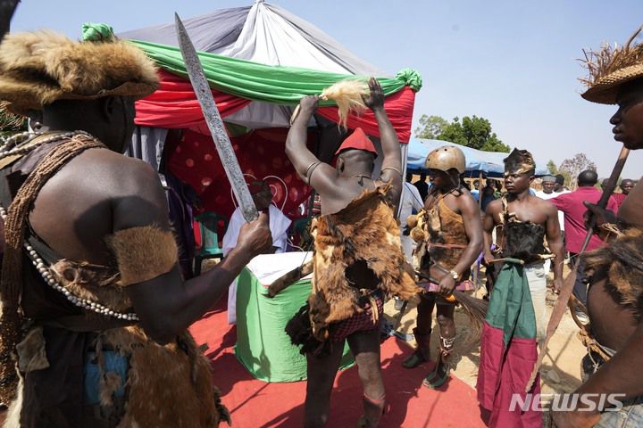 [리욤=AP/뉴시스] 1일(현지시간) 나이지리아 중부 리욤에서 연례 새해 축하 행사가 열려 베롬 부족 전통의상을 입은 무용수들이 흥겹게 춤추고 있다. 2023.01.02.