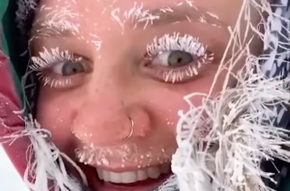 눈썹, 속눈썹, 인중, 머리카락 모두 꽁꽁 얼어붙었다. [사진=틱톡 @Emily Davis] |