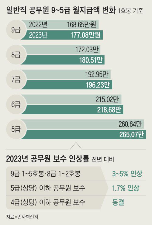 인상 후 5급 1호봉 월급은 265만700원이다. 작년보다 5%가 오른 9급 1호봉 월급은 177만800원이다.