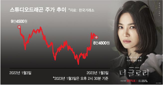 스튜디오드래곤 역시 '더 글로리'를 공개하기 직전인 지난달에만 20% 넘게 오르며 강세를 보였다. 최근에는 12월 기상승분 영향 등으로 주춤했지만 '한한령'(限韓令, 한류 제한령) 해제와 호실적 기대감이 커지는 점이 긍정적으로 평가된다.