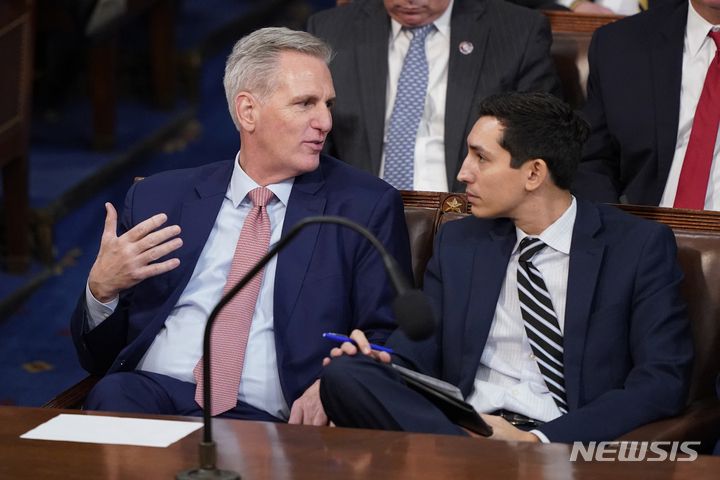 [워싱턴=AP/뉴시스] 케빈 매카시 미 하원 공화당 원내대표(왼쪽)가 3일(현지시간) 미 워싱턴DC 의사당에서 열린 제118차 의회 개회식에서 하원의장 선거가 진행되는 동안 보좌관과 이야기를 나누고 있다. 2023.01.04.