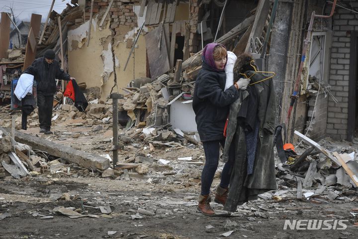 [자포리자=AP/뉴시스] 1일(현지시간) 우크라이나 자포리자 주민들이 러시아군의 로켓 공격으로 폐허가 된 집을 나서면서 소지품을 챙기고 있다. 2023.01.02.
