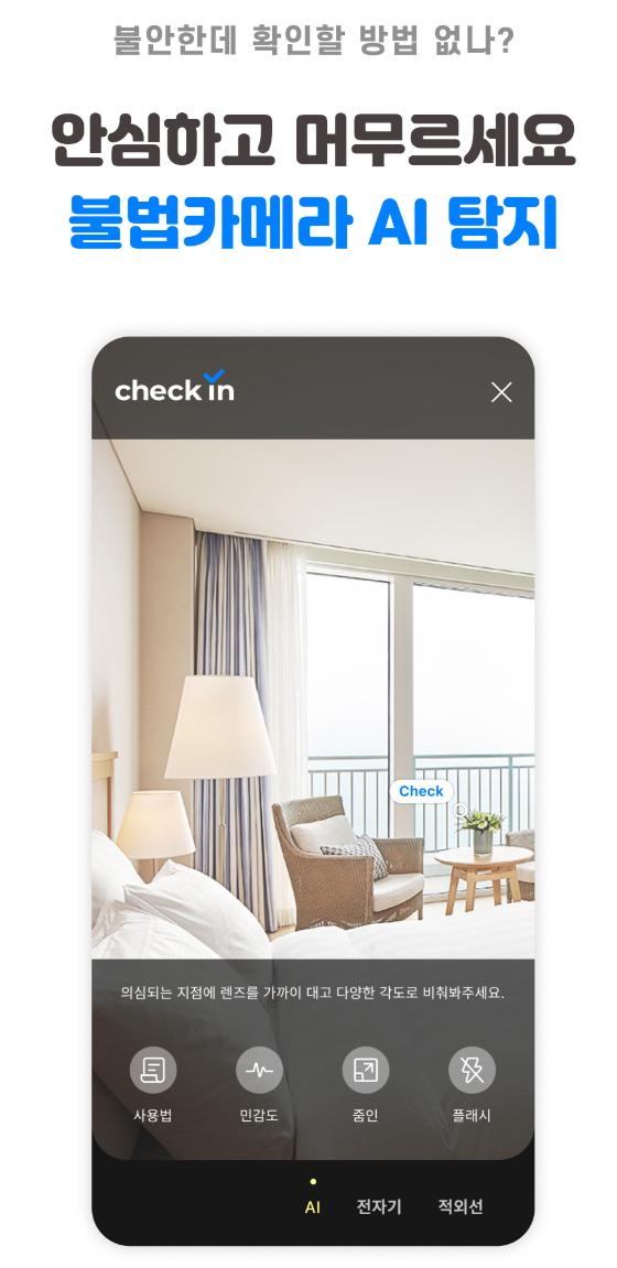 '체크인'은 지난해 6월 오픈했다. 불법 카메라 탐지 기능은 지난해 여름 이벤트 형태로 제공하다가 최근 전면 무료화했다. 소비자는 '체크인' 내 플러스 버튼만 누르면 된다. 적외선 및 전자기 탐지기를 AI가 탐지할 수 있는 게 특징이다. 불법 카메라가 나온 숙박업소를 제보하는 하는 기능도 있다. 제보를 바탕으로 이슈가 있는 숙박업소는 '체크인'에서 취급하지 않기로 한 것이다.