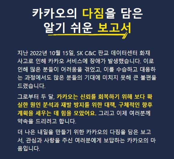 카카오는 인프라 전문 조직 재정비와 자체 데이터센터 보완 등의 재발 방지 대책을 강조하며 "다시는 모두의 대화가 멈추는 일이 없도록 하겠다"고 덧붙였다.