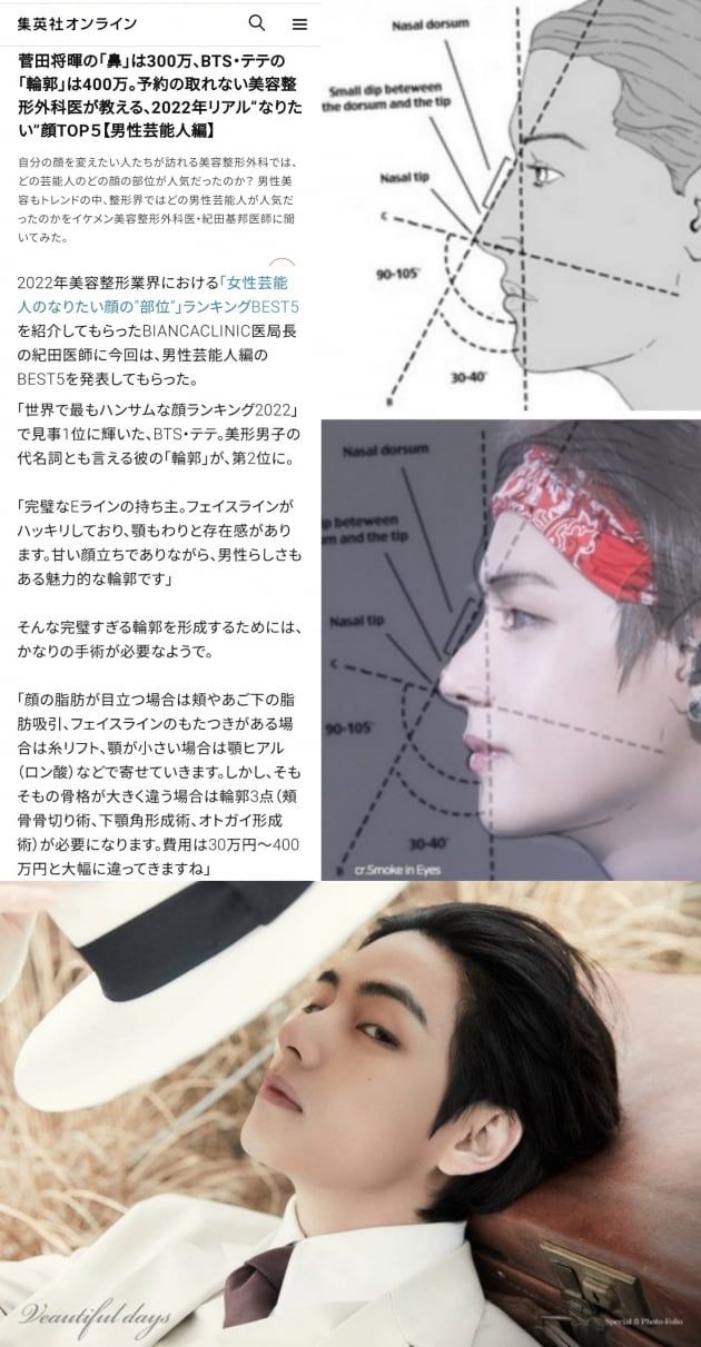 일본의 성형전문의는 “뷔는 완벽한 E라인의 소유자로 뚜렷한 페이스라인과 턱으로 인해 부드러우면서도 남성스러움이 공존하는 매력적인 얼굴형”이라고 평가하며 “뷔처럼 완벽한 얼굴윤곽을 만들기 위해서는 상당한 수술이 필요하다”고 설명했다. 이어 뷔와 같은 얼굴형을 갖기 위해서는 4000만원에 상당하는 비용이 필요하다고 덧붙였다.