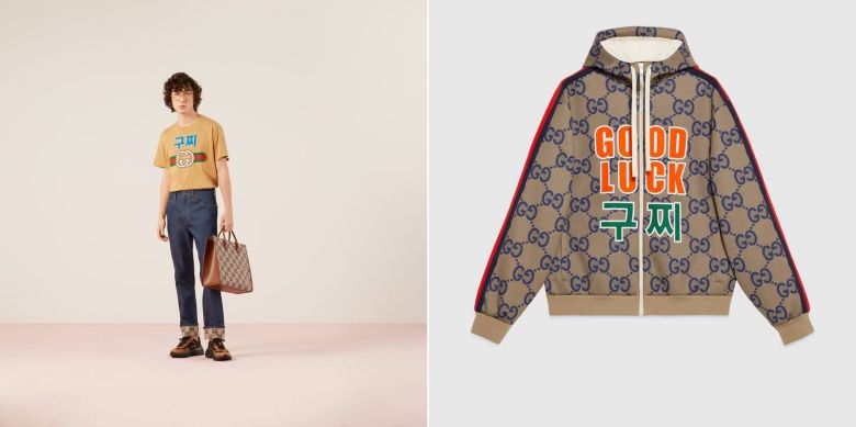 한글이 그려진 제품 중 가장 고가의 제품은 집업 형태 후드티셔츠로, 320만원에 판매 중이다. ‘GOOD LUCK(행운을 빈다)’이라는 주황색 영문과 함께 ‘구찌’라는 초록색 한글이 써졌다. 구찌를 상징하는 모노그램을 배경으로 맥시멀한 감성을 담았다는 게 구찌의 설명이다.
