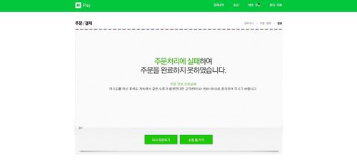 이날 오후 4시 15분께 네이버 쇼핑의 상품 페이지에서 결제 버튼을 클릭하면 '주문처리에 실패하여 주문을 완료하지 못했다'는 안내가 표시되며 결제 페이지로 넘어가지 않는다.