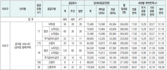 이번 신규공급 중 가장 많은 350세대를 모집하는 단지 '공덕동 크로시티'를 직접 방문해 위치와 평형, 임대조건을 알아보았다. 업체 관계자에 따르면 단지는 300m 부근에 지하철 5,6,9호선 공덕역, 지하철 공항철도 공덕역이 있어 근방으로 출퇴근하는 직장인에게 매력적인 접근성을 제공한다. 전용면적 17~36㎡ 총 350세대로 조성돼 주택형별로는 △17㎡ 대학생 56세대 △17㎡ 청년 60세대 △18㎡ 청년 120세대 △17㎡ 고령자 20세대 △18㎡ 고령자 8세대 △36㎡ 신혼부부 44세대이다.