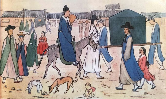 조선이 모자 왕국이라는 사실을 보여주는 그림도 있다. 스코틀랜드 여성 화가 콘스탄스 테일러가 1904년 발간한 ‘조선의 일상’에 실린 ‘서울 풍경’이다. 지금의 광화문 광장인 육조거리에서 그린 이 한 장의 풍경화에는 오가는 행인들이 쓰고 있는 쓰개(모자)만 해도 사모, 갓, 초립, 패랭이, 방갓, 장옷, 쓰개치마 등 일곱 가지나 볼 수 있다.