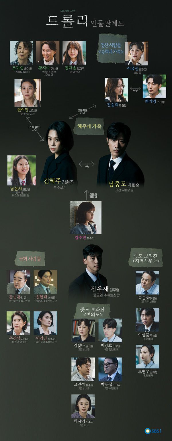 지난 9일 방송된 SBS 월화드라마 '트롤리'(연출 김문교, 극본 류보리, 제작 스튜디오S) 7회 시청률은 수도권 4.9% 전국 4.2%(닐슨코리아 기준), 순간 최고 6.2%를 기록했다. 이날 인물관계도 속 남중도(박희순 분)는 아내 김혜주(김현주 분)의 숨겨진 과거 비밀을 마주했다. 성범죄 가해자의 비겁하고 무책임한 죽음으로 더 큰 상처와 죄책감마저 떠안아야 했던 김혜주, 그리고 20년이 지나도 달라진 것 하나 없는 '남궁솔 사건'에 남중도는 법률 개정으로 변화의 바람을 일으키려 했다.