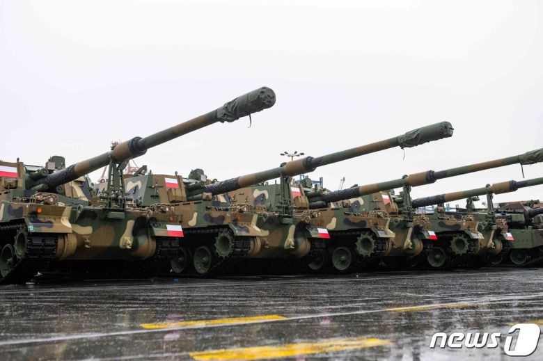 6일(현지시간) 폴란드 그디니아의 해군기지에 도착한 '한국산 명품무기' K-2 전차와 K-9 자주포의 첫 수출 물량이 도열되어 있다. ⓒ AFP=뉴스1 ⓒ News1 우동명 기자