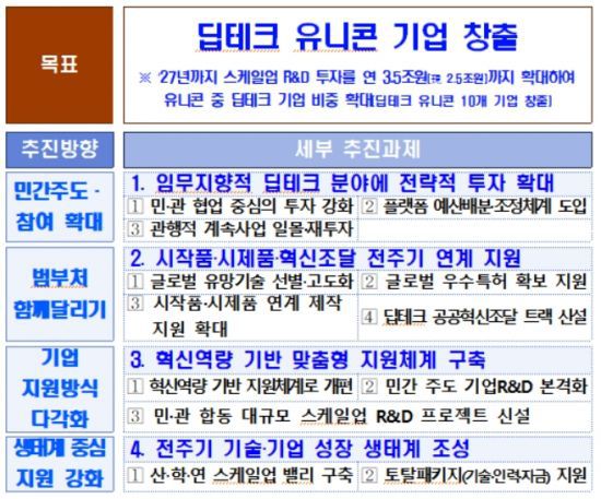 과학기술정보통신부는 12일 영상회의로 열린 제16차 비상경제장관회의에서 이러한 내용을 골자로 한 '범부처 스케일업 연구개발 투자전략'을 발표했다. 과기정통부는 5년간(2023년~2027년) 15조원을 투입해 딥테크 유니콘 기업 10곳을 창출한다는 목표를 세우고 민간 참여 확대·범부처 협력 강화·기업 지원방식 다각화·생태계 중심 지원 등을 4대 기본방향으로 설정했다.