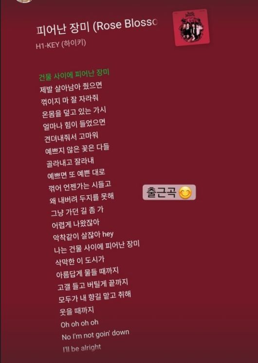이미주는 13일 자신의 SNS에 '출근곡'이란 글과 함께 걸그룹 하이키의 신곡 ‘건물 속에 피어난 장미’를 듣는 화면을 캡처에 올렸다.