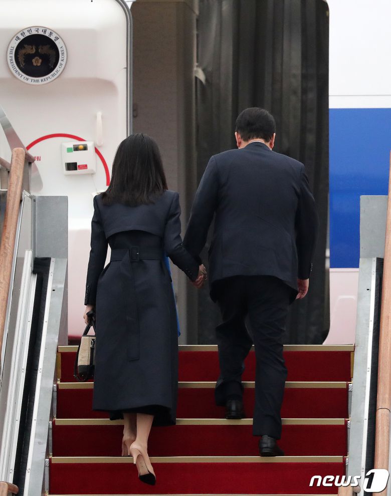 김건희 여사와 손 잡고 공군 1호기 탑승하는 윤석열 대통령