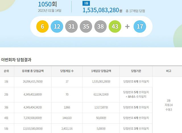 제1050회 로또복권 당첨번호 조회 결과 1등 대박 주인공은 17명이다. 1등 당첨금은 15억3508만 원이다. /동행복권 캡처 |