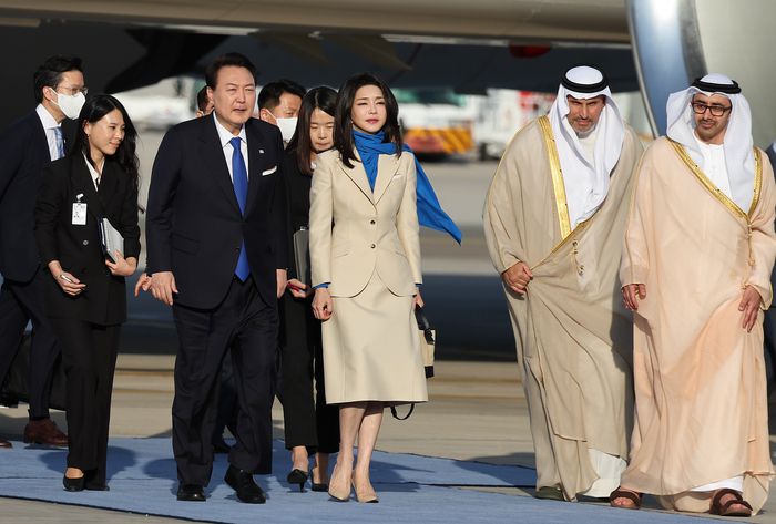 윤석열 대통령과 김건희 여사가 14일(현지시간) 아랍에미리트연합(UAE) 아부다비 왕실공항에 도착해 이동하고 있다. 연합뉴스 |