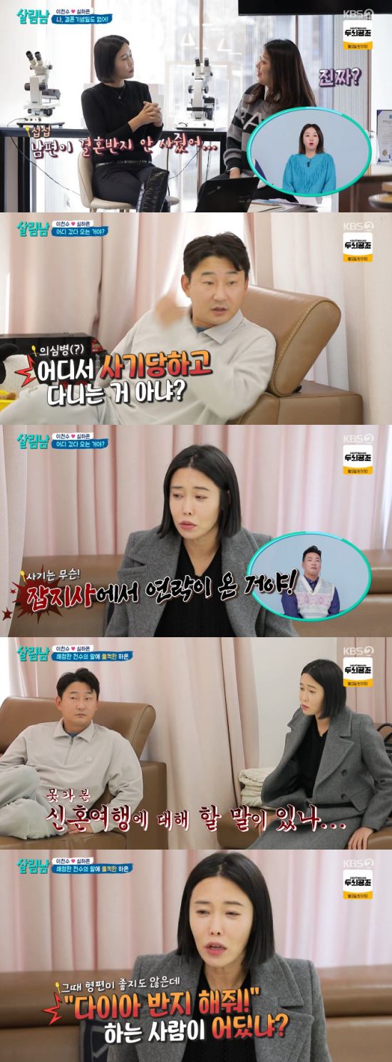 이천수는 인터뷰를 마치고 귀가한 심하은에게 "뭘 그렇게 돌아다니냐"라며 불만을 토로했다. 심하은은 "웨딩 화보 들어와서 피팅 다녀오는 길이다"라며 설명했고, 이천수는 "아줌마한테 무슨 웨딩 화보가 들어오냐. 사기당하고 다니는 거 아니냐"라며 툴툴거렸다.