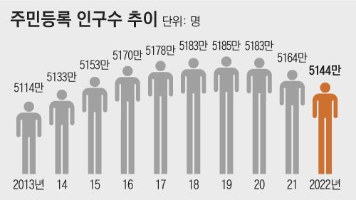 15일 행정안전부에 따르면 작년 12월 31일 기준 우리나라 주민등록 인구통계상 주민등록 인구는 5143만9038명으로 2021년 5163만8809명보다 19만9771명(0.39%) 줄었다.