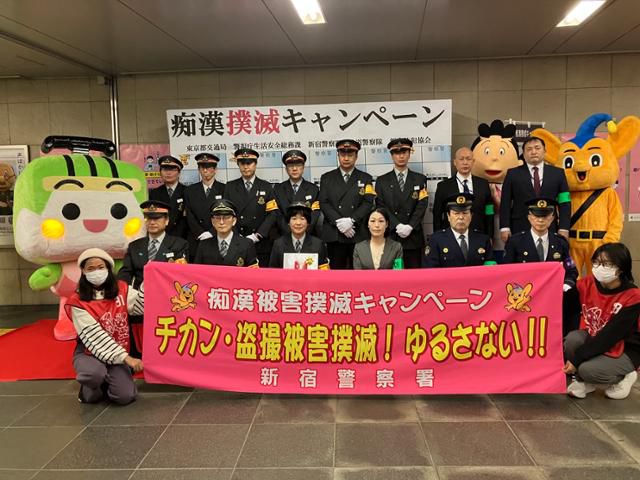 도쿄도 신주쿠경찰서 소속 경찰관들이 1월 14, 15일 실시되는 '대입 공통 테스트'를 앞두고 '치한 박멸 캠페인'을 벌이기에 앞서 기념촬영을 하고 있다. 도쿄도 교통국 트위터 캡처