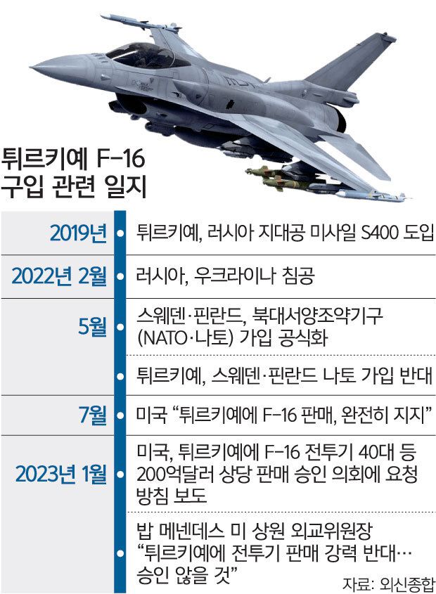 조 바이든 미국 행정부가 튀르키예(터키)에 F-16 전투기 등 200억달러(약 24조8000억원) 규모의 무기를 팔기 위한 요청에 의회가 제동을 걸었다. 스웨덴·핀란드의 북대서양조약기구(NATO·나토) 가입을 적극 지지하지 않는 튀르키예에 대한 일종의 압박으로 풀이된다.