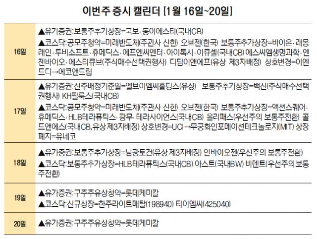 이번 주 국내 증시에서는 한주라이트메탈, 티이엠씨가 코스닥시장에 신규 상장한다. 미래반도체와 오브젠은 공모주 청약을 진행한다.