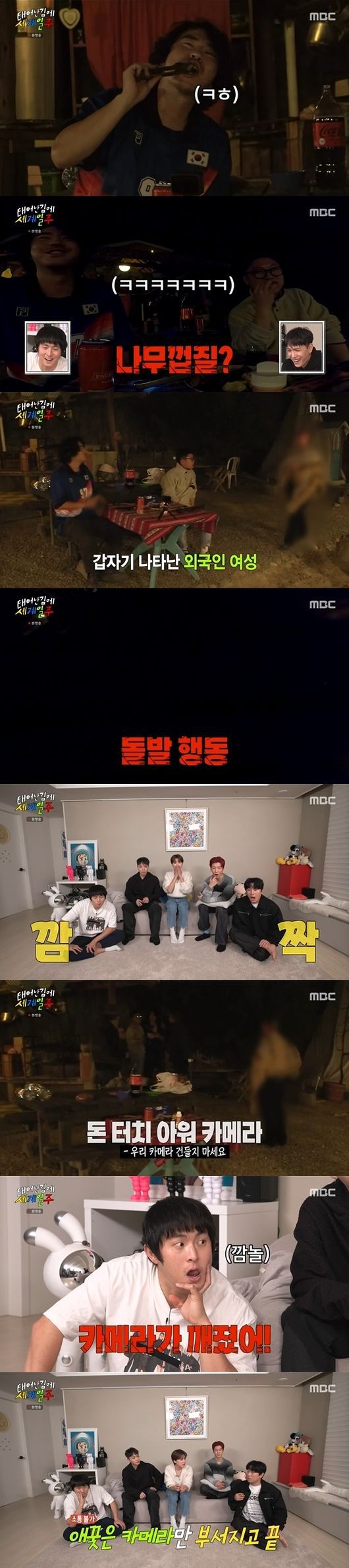 이후 외국인 여성은 캠핑장을 떠났지만 이미 빠니보틀의 카메라는 깨졌고, '태계일주' 팀은 아무런 잘못도 없이 날벼락을 맞은 셈이다. 장도연은 "여기 여행은 예측이 안 된다"고 덧붙였다.