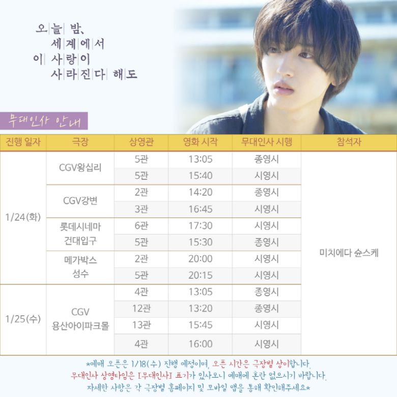 [스포츠W 노이슬 기자] 일본 로맨스 영화의 새로운 흥행 기록을 쓰고 있는 '오늘 밤, 세계에서 이 사랑이 사라진다 해도'가 개봉 49일 차인 바로 오늘(17일) 누적 관객 수 90만 관객을 돌파하며 100만 돌파 카운트 다운에 돌입한 가운데, 장기 흥행에 불을 지필 배우 미치에다 슌스케의 흥행 감사 내한 일정을 공개했다.