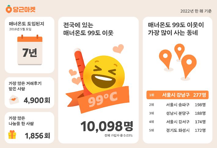 지난 2016년 도입해 올해로 7년 차를 맞이한 매너온도 제도를 통해 지금까지 총 1만 98명이 99도를 달성했으며, 50도 이상 매너온도를 획득한 이용자도 31만 6513명에 달하는 것으로 분석됐다.
