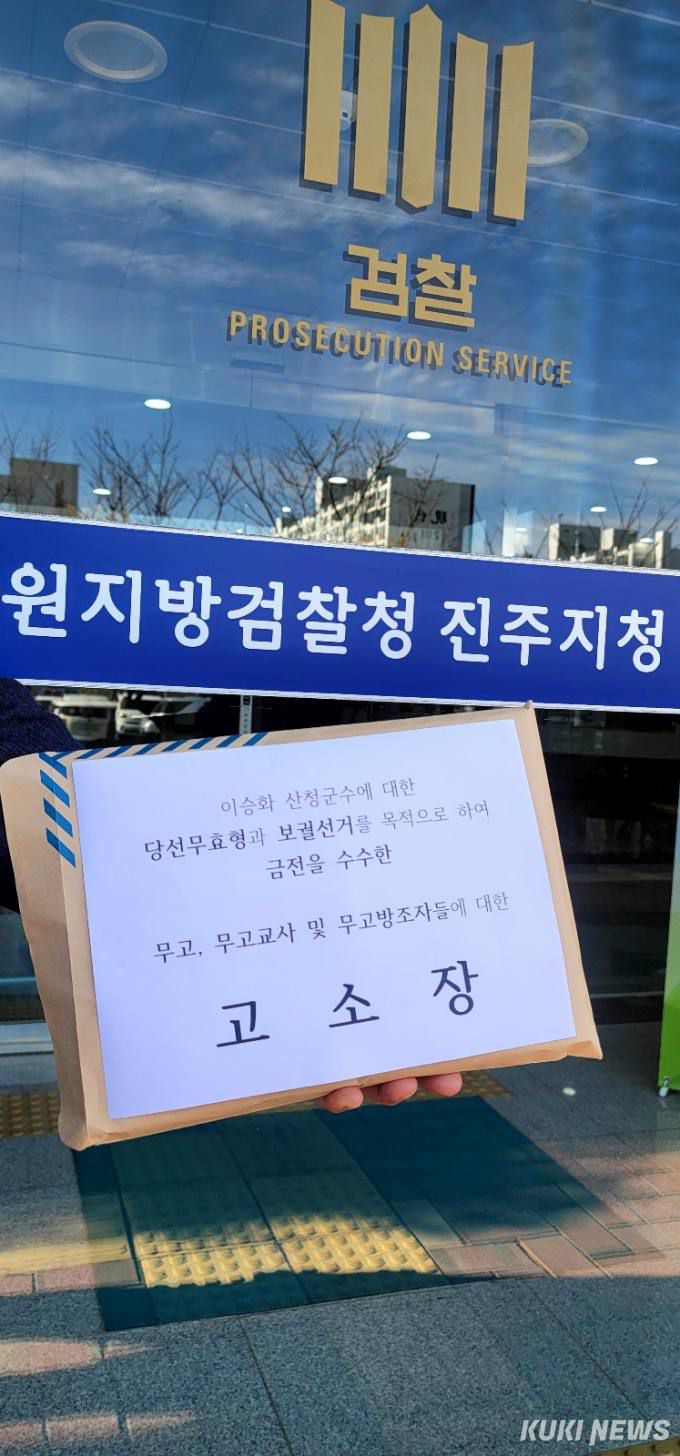 이승화 산청군수 외 3명의 법률대리인인 법무법인 다승은 지난 17일 박우식 외 5명을 무고·무고교사·무고방조 혐의로 창원지방검찰청 진주지청에 고소장을 제출했다고 18일 밝혔다.